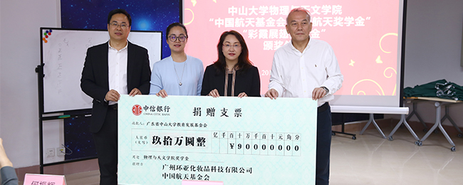 “中國航天基金會-環(huán)亞航天獎學金”由環(huán)亞集團捐資設立,用以獎勵中山大學物理與天文學院及學校航天方向品學兼優(yōu)、全面發(fā)展的同學,激勵學生勤奮學習、大膽創(chuàng)新、努力進取,成為航天事業(yè)棟梁之才。